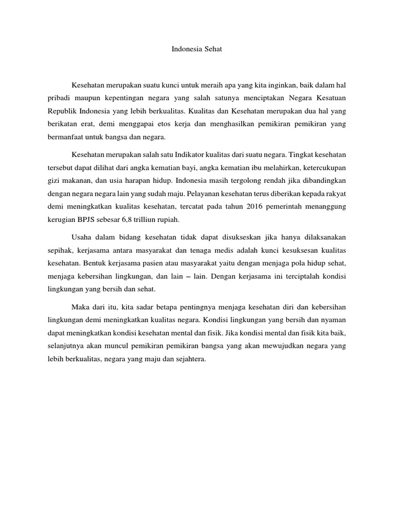 Berikut adalah contoh esai tentang kesehatan dalam bahasa Indonesia yang dimuat di Republika 3 Februari 2007 dan dikutip dari Piawai Berbahasa Cakap Bersastra Indonesia 3. Pengarang esai disebut esais. Contoh Essay Bahasa Inggris tentang Kesehatan Masyarakat 2 As of now Public Health in Indonesia can be said to be in a condition which is as of now showing signs of improvement albeit there are still a few individuals who are living a long way from a sound way of life.