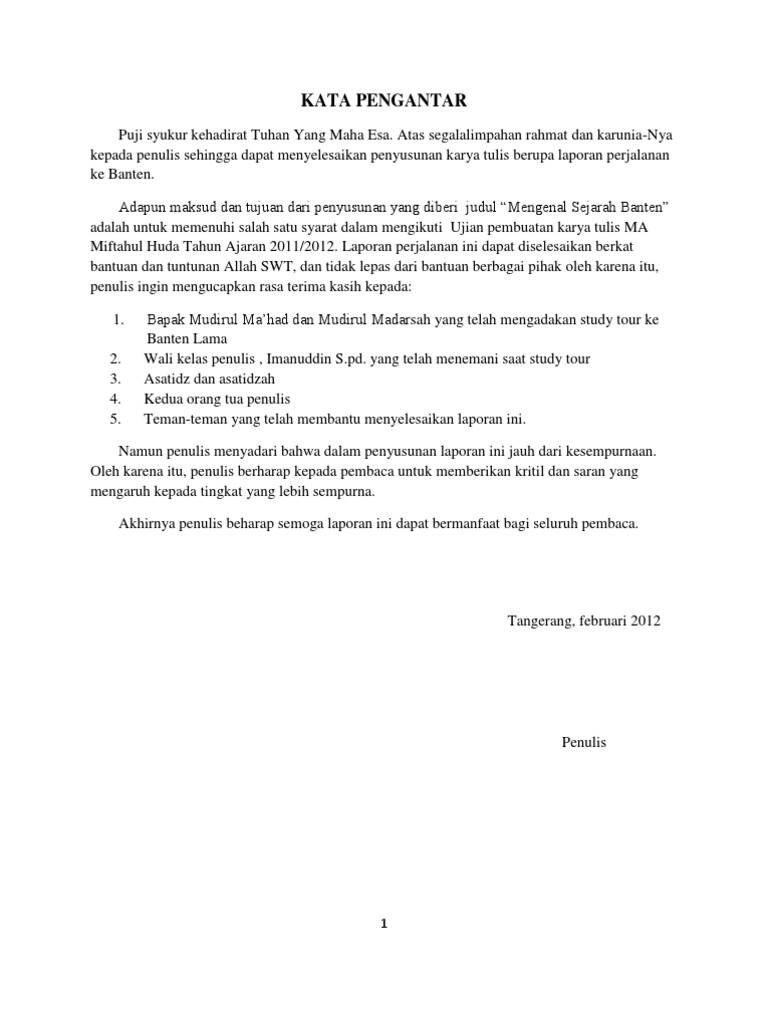 Contoh kata pengantar karya tulis study wisata. Berikut ini adalah contoh kata pengantar karya ilmiah. Kata pengantar menjadi satu bagian yang wajib ada di setiap karya tulis terutama karya tulis ilmiah seperti contoh makalah laporan penelitian proposal serta skripsi. Judul Laporan Study Wisata.