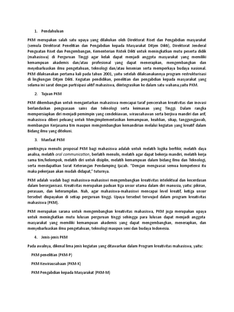 Contoh pendahuluan proposal pkm. Format Justifikasi Anggaran Kegiatan contoh. Proposal harus mampu menggambarkan peluang dan rencana usaha yang akan diajukan serta potensi keberlanjutannya Gambaran situasi yang menimbulkan gagasan meraih peluang berwirausaha serta kondisi lingkungan yang mendukung Gambaran umum rencana usaha dapat diuraikan dalam bentuk bussiness plan. PROPOSAL PROGRAM KREATIVITAS MAHASISWA PKM-K.