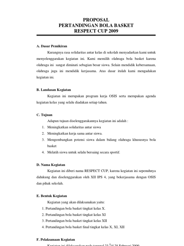 Menjadikan salah satu wadah bagi siswasiswi se-SMA JAKARTA UTARA untuk menyalurkan bakat olahraga futsal. Basket 1 -8 November 2014 1335 WIB -Selesai 2. Contoh proposal pengadaan kegiatan olahraga proposal.