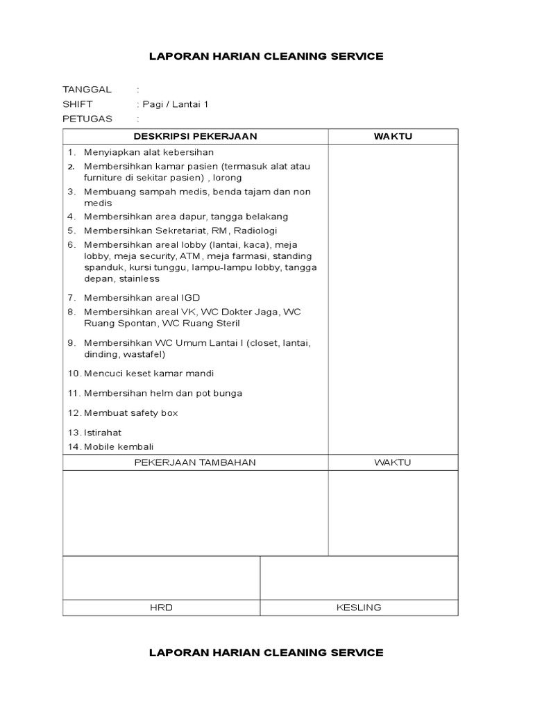 PEKERJAAN RUTIN HARIAN CLEANING SERVICE. Contoh form check list kerja cleaning service. Inilah contoh laporan harian pekerjaan cleaning service dan hal lain yang berhubungan erat dengan contoh laporan harian pekerjaan cleaning service serta aspek K3 secara umum di Indonesia.