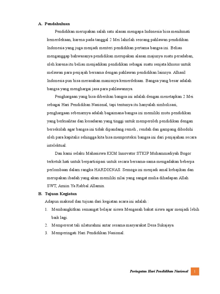 Penghargaan yang bisa diberikan bangsa ini adalah dengan menetapkan 2 Mei sebagai Hari Pendidikan Nasional tapi tentunya itu hanyalah simbolisasi penghargaan sebenarnya adalah bagaimana bangsa ini memiliki mutu pendidikan yang berkualitas dan kesadaran yang tinggi untuk memperoleh pendidikan dengan bersekolah agar bangsa ini tidak dipandang remeh rendah dan. Maka dalam rangka menyambut Milad KAPEMAPAN Ke-3 dan memperingati hari pendidikan nasional kami Keluarga Pelajar Mahasiswa Pangandaran akan mengadakan kegiatan yang menunjang implementasi dari pengabdian kami kepada para pemuda bangsa yaitu mengadakan seminar pendidikan dengan tema Konsepsi Pendidikan Berkarakter Guna Menujang Pariwisata Kabupaten. Contoh proposal peringatan hari pendidikan nasional Sambutan Peringatan Hari Pendidikan Nasional disingkat.