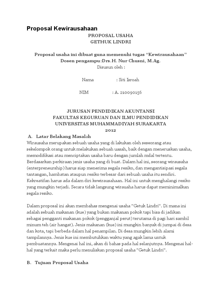 Contoh Proposal Kewirausahaan Getuk Pisang. Manfaat dari usaha Kerupuk KRISBI ini adalah Membangun jiwa wirausaha bagi mahasiswa sehingga dapat melihat peluang dan memanfaatkannya menjadi sesuatu yang bernilai ekonomis Memanfaatkan singkong sehingga memiliki nilai jual yang tinggi Membuka peluang usaha bagi masyarakat yang ingin menciptakan lapangan kerja. Oleh karena itu bisnis makanan ini sangatlah layak untuk dikembangkan menjadi salah satu bisnis kuliner alternative yang ada di Indonesia maka kami membuat usaha Gethuk Pisang Khas Kediri agar masyarakat lebih mengenal makanan tradisional khas Indonesia terutama makanan yang satu ini.