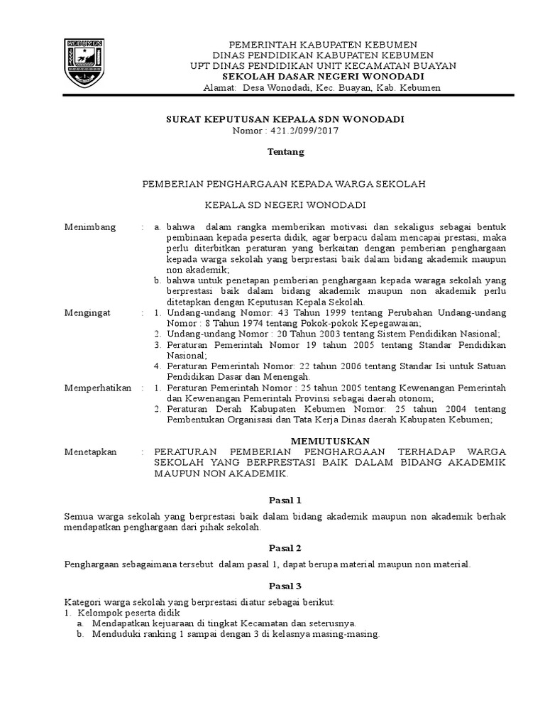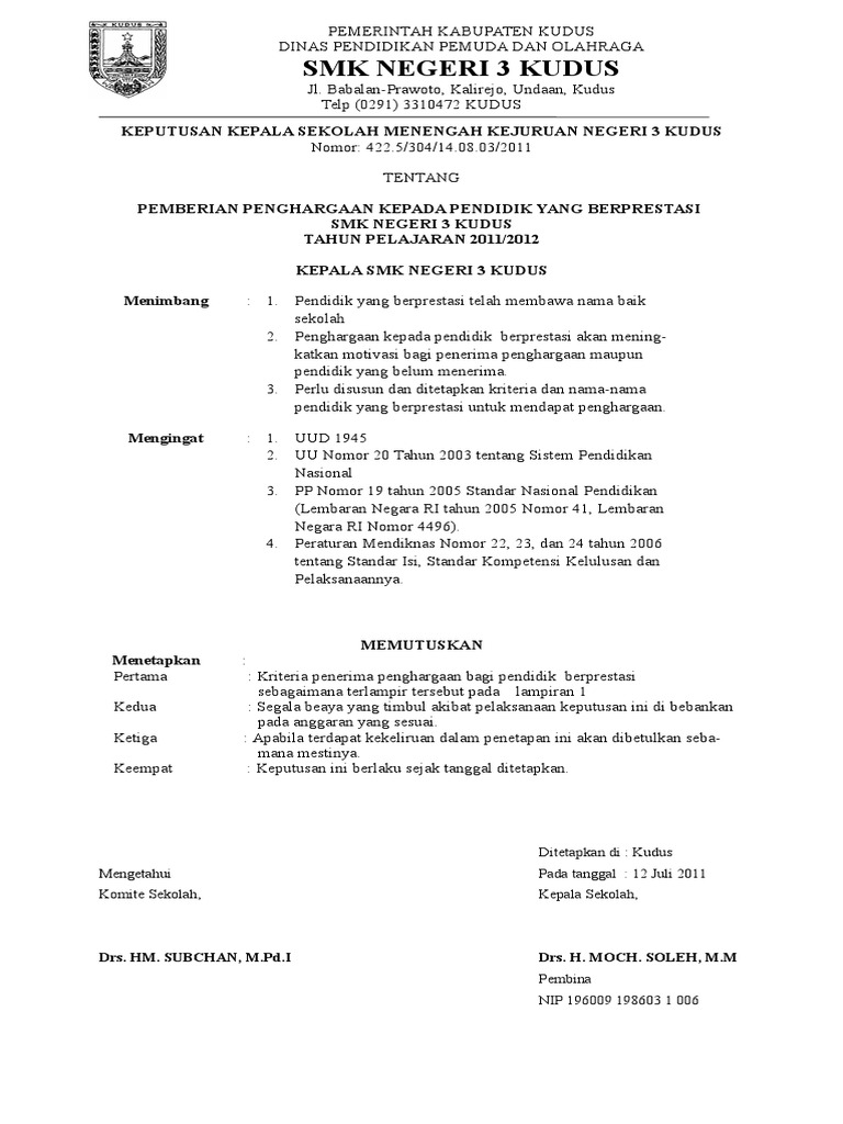 Contoh sk pemberian penghargaan kepada guru. 42253041408032011 TENTANG PEMBERIAN PENGHARGAAN KEPADA PENDIDIK YANG BERPRESTASI SMK NEGERI 3 KUDUS TAHUN PELAJARAN 20112012 KEPALA SMK NEGERI 3 KUDUS Menimbang. Fotocopi SK Pangkat terakhir dilegalisir. Keputusan Jenderal Pendidikan Tinggi Departemen Pendidikan dan Kebudayaan Republik Indonesia No.