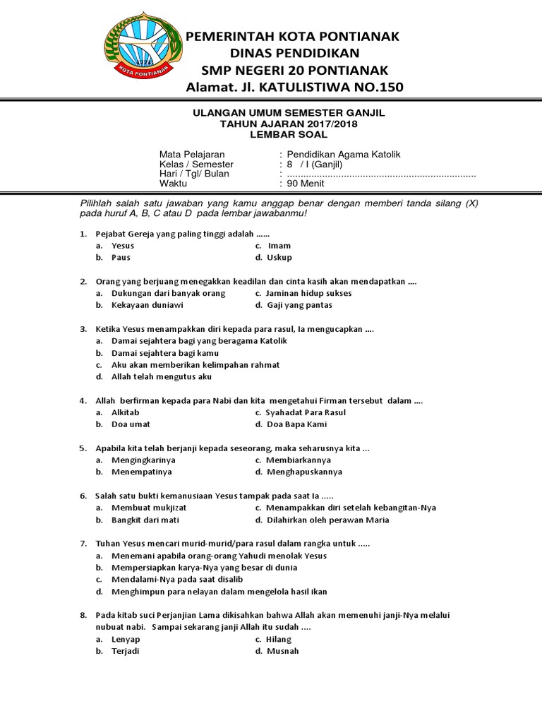 Download soal uas agama kristen kelas 8 smp semester 1 dan kunci jawaban. Untuk Format PDF bisa dibuka melalui android atau melalui PC dengan aplikasi foxit reader. Hitamkanlah salah satu pilihan yang benar pada huruf a b c atau d pada lembar jawaban.