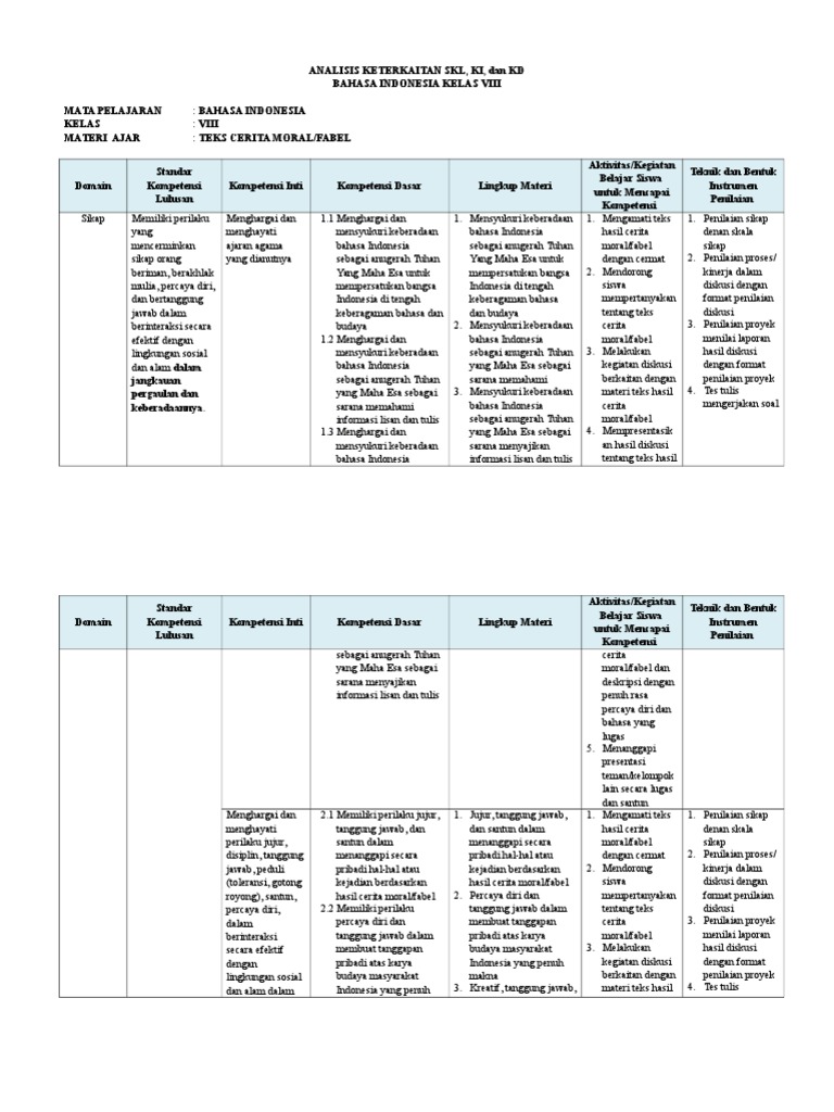 Analisis ki kd bahasa indonesia kelas 8. Analisis Keterkaitan Skl Ki Dan Kd Bahasa Indonesia By Soal Terbaru Last updated 4 Feb 2019 374 0 K13 Kurikulum 2013 Apa kabar BapakIbu guru Kelas SD maupun Guru Mata Pelajaran Mapel jenjang SMPSMASMK sederajat Berikut admin share mengenai ANALISIS KETERKAITAN SKL KI dan KD. 29 Nov 2018. Download Analisis SKL KI KD Bahasa Indonesia Kelas 8 K13 Afgun 0121 Bahasa Indonesia Perangkat Pembelajar Comment sebelum klik tombol download mungkin anda juga perlu menyimak postingan yang ini.
