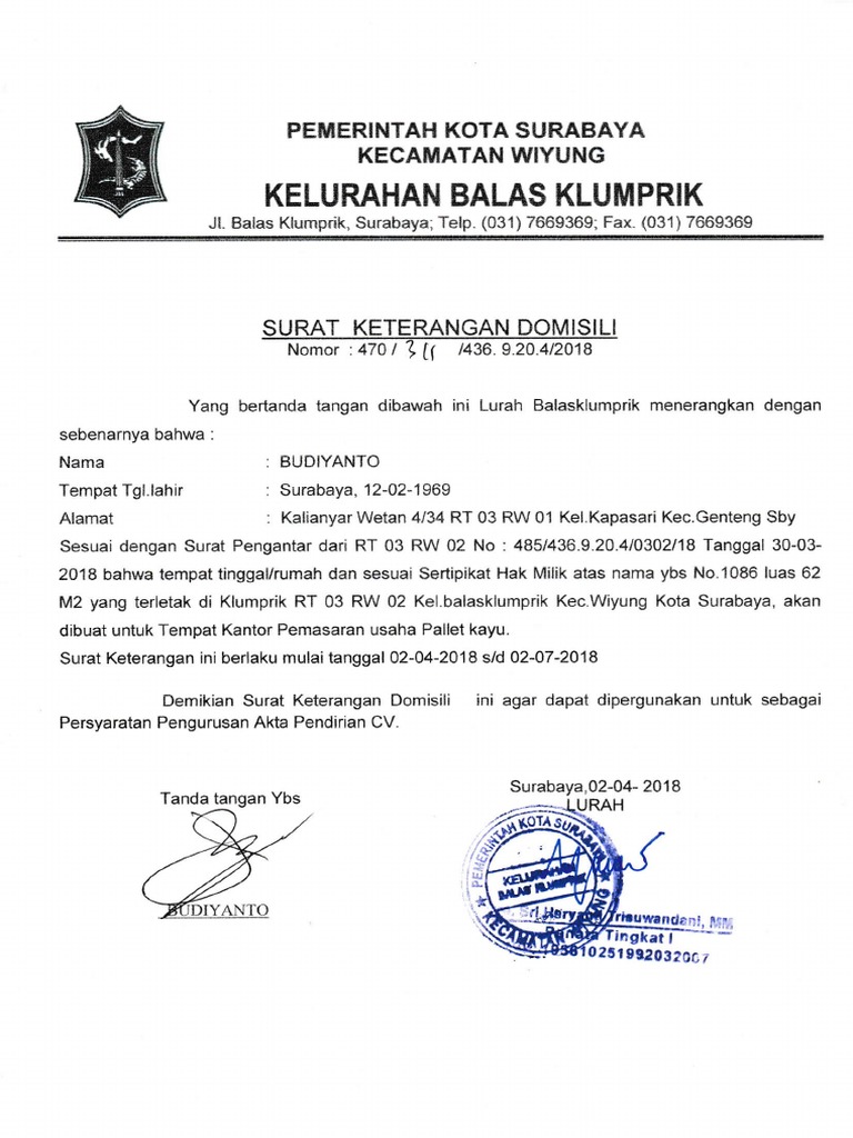 Membawa fotocopy KTPSIM sesuai dengan domisili yang tertera di surat pengantar dari Kantor Kelurahan. Cara Membuat Surat Keterangan Domisili. Surat Keterangan domisili tinggal di Surabaya Bagi Penduduk Non Surabaya bagi PPDSPPDGS Surat pernyataan tempat tinggal.