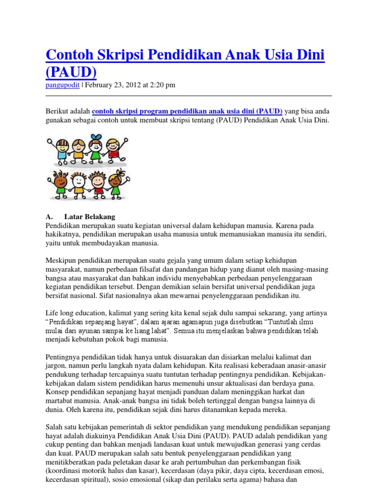 Kemudian saya masuk ke salah satu situ perpustakaan online dan menemukan beberapa contoh penelitian tindakan kelas yang kami cari. Contoh skripsi paud berikut kami sajikan berbagai tema untuk paud pendidikan anak usia dini dalam daftar contoh skripsi paudsaat ini tidak asing lagi bagi kita bila mendengar paud. SKRIPSI PROGRAM PENDIDIKAN ANAK USIA DINI PAUD DALAM MEMPERSIAPKAN ANAK KE JENJANG SEKOLAH FORMAL - gudang makalah skripsi dan tesis CONTOH SKRIPSI PAUD October 23rd 2012.