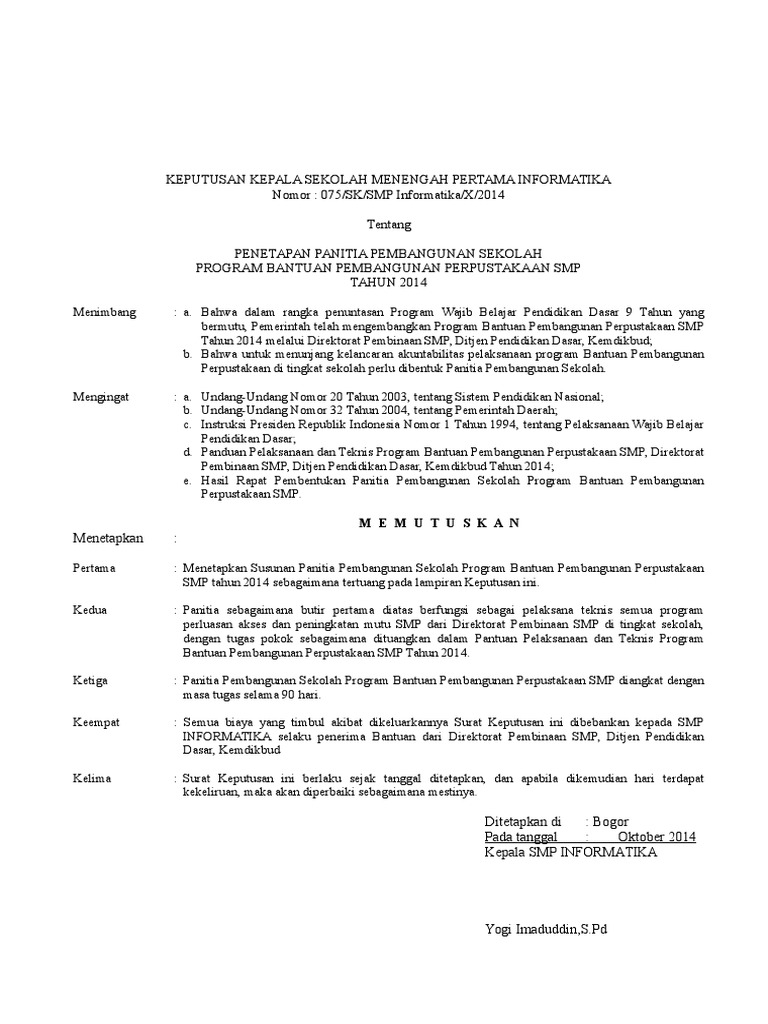 Contoh sk panitia pembangunan sekolah. KEPUTUSAN KEPALA SEKOLAH MENENGAH PERTAMA INFORMATIKA. 5 Contoh SK Tim Pengembang Sekolah Terbaru. 19 4 99 Perlengkapan Administrasi Ujian Tahun 2016 2017.