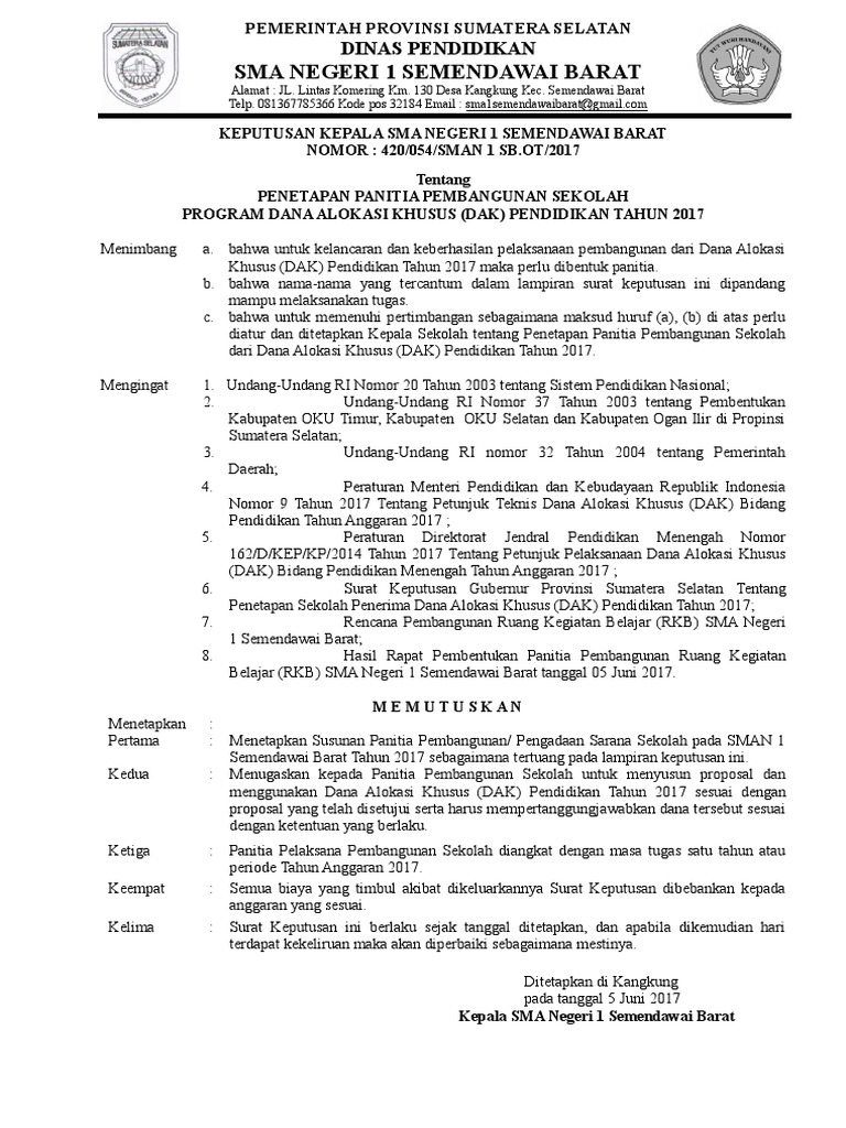 SK PANITIA PEMBANGUNAN SEKOLAH. Contoh Sk Hut Ri. Mengesahkan Panitia Pembangunan Masjid Nur Al-Iman yang selanjutnya disebut sebagai Panitia Pembangunan dengan susunan kepanitiaan dan personalia sebagaimana tercantum dalam lampiran surat keputusan ini.
