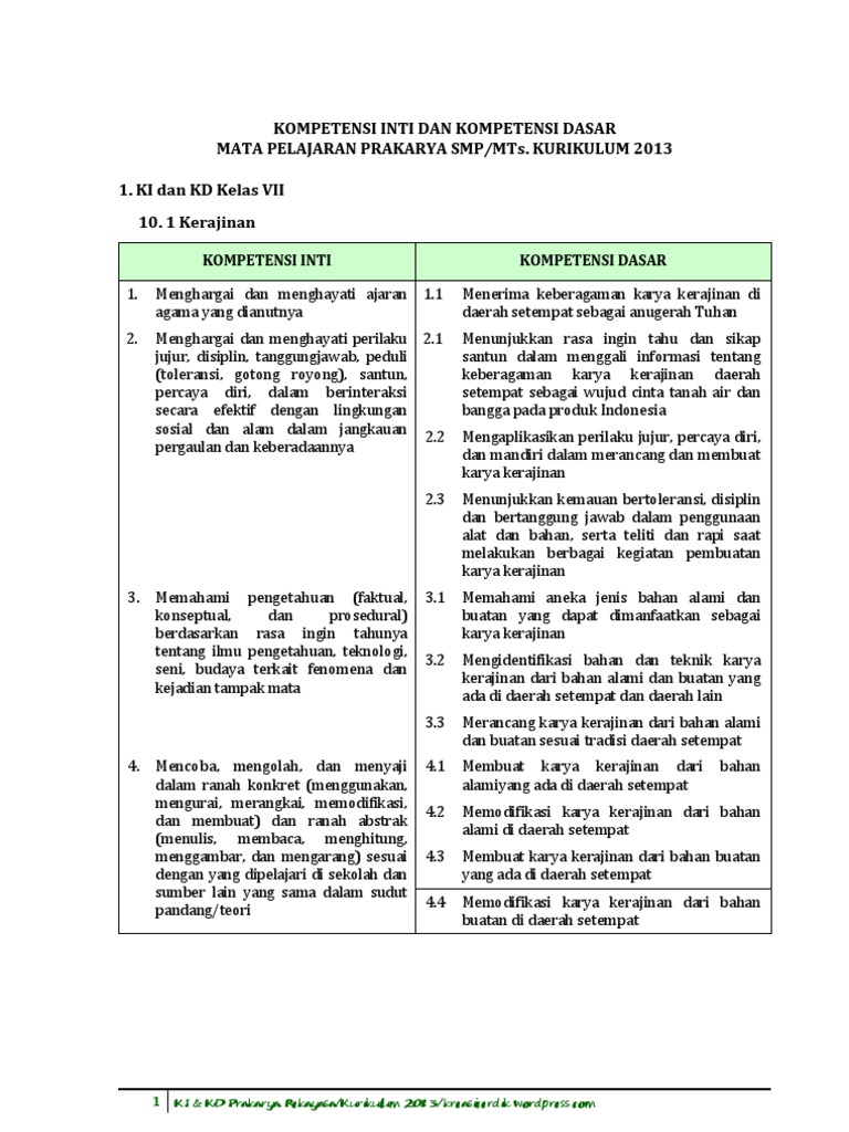 Doc Kompetensi Inti Dan Kompetensi Dasar Prakarya Sekolah Menengah Pertama Smp Madrasah Tsanawiyah Mts Kang Dayat Academia Edu