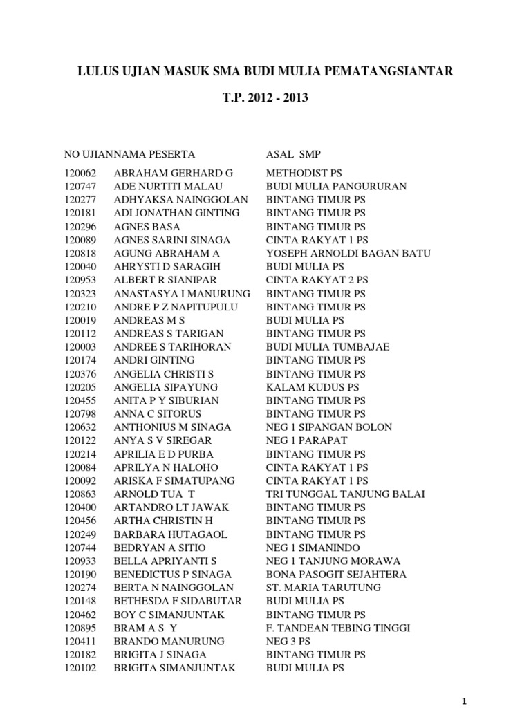 Lulus Ujian Masuk Sma Budi Mulia Pematangsiantar