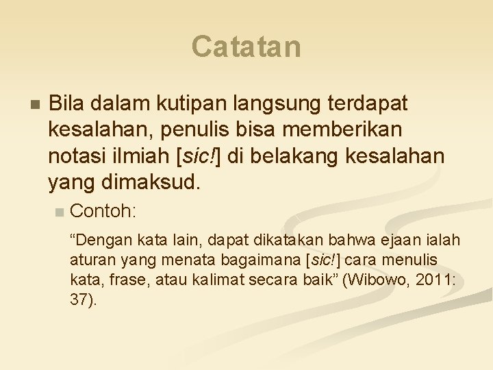 Dalam menulis kutipan langsung pengutip tidak diperkenankan mengubah kata atau kalimat yang diambil dari sumber. Terpisah dari teks dengan spasi jarak antarbaris lebih dari teks. Memakai tanda sic apabila terdapat kesalahan dalam teks aslinya.
