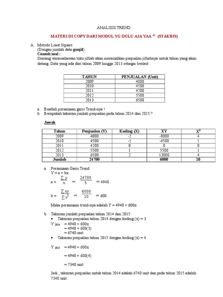 Ini 5 Contoh Soal Elastisitas Permintaan Dan Penawaran Jawabannya. ANALISIS TREND DENGAN CARA KUADRAT TERKECIL LEAST SQUARE METHOD Trend dengan metode kuadrat terkecil diperoleh dengan menentukan garis trend yang mempunyai jumlah terkecil dari kuadrat selisih data asli dengan data pada gars trend. Metode Semi Rata-rata Membagi data menjadi 2 bagian Menghitung rata-rata kelompok.
