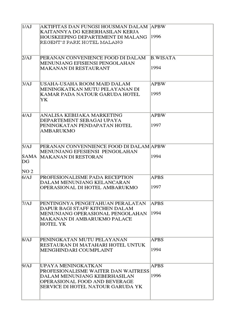 Kumpulan judul skripsi manajemen perhotelan. Untuk memudahkan dalam mencari judul skripsi maupun tugas akhir Anda bisa menggunakan fitur search dan memasukkan kata kunci di bawah ini. Mata Pelajaran Food and Beverage Serviceâ sebagai salah satu persyaratan. Contoh Skripsi Hukum Tatanegara.