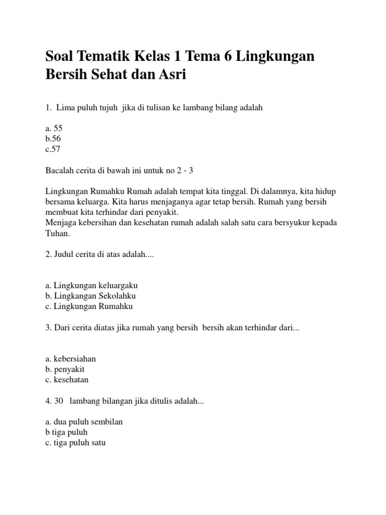 Soal Tematik Kelas 1 Tema 6 Lingkungan Bersih Sehat Dan Asri