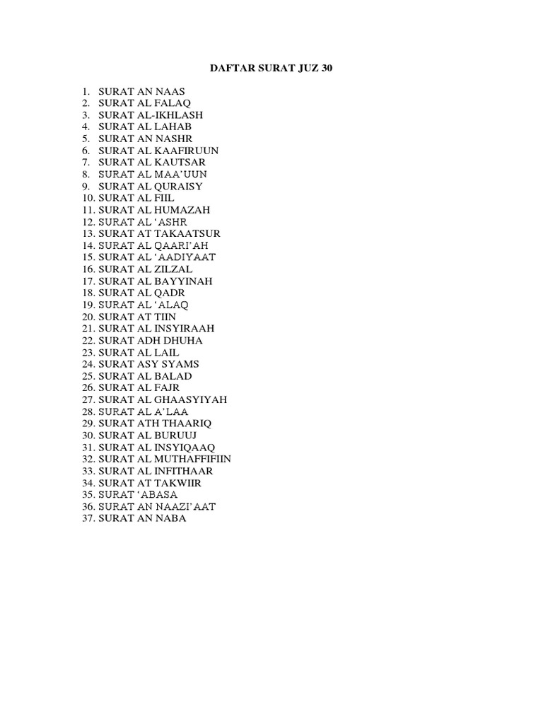 Juz 30 sendiri memiliki 37 surat dari mulai surat An-Naba sampai Surat An-Nas. Daftar Urutan Nama Surat Di Juz 30 Al Quran Dan Artinya. An-Naziaat النازعات Ia Bermuka Asam.